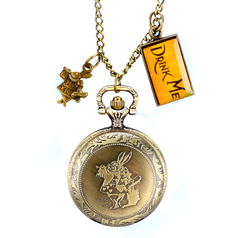 Gallery for Free Shipping Vintage Bronze Alice in Wonderland Drink Me Rabbit and Littel Girl Pattern Quartz Pocket Watch Ladies Women Gift